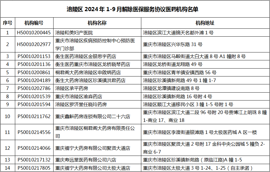 为落实定点医药机构协议动态管理要求,根据国家医疗保障局《医疗机构医疗保障定点管理暂行办法》《零售药店医疗保障定点管理暂行办法》及《重庆市医疗保险协议医疗机构服务协议》《重庆市医疗保险协议零售药店服务协议》等文件规定,解除以下定点医药机构医保服务协议。