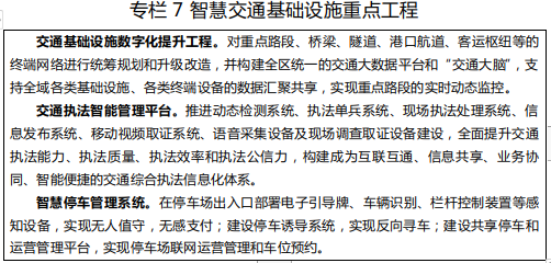 建设智慧交通基础设施。推进“数字道路”建设,推进公路、铁路、桥梁、隧道、枢纽等交通动脉多功能智能杆及配套基础设施建设,加强交通信号灯、公安视频、5G基站、环境监测等多功能集成;提升普通公路管养数字化水平,统一智慧道路管理运维。推进“数字枢纽”建设,加大高铁站、长途汽车站、公交场站智能升级,推动售取票、检票、安检、换乘、停车等客运服务“一码通行”。