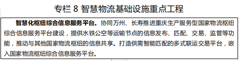 搭建多式联运信息协同体系和智慧化枢纽综合信息服务平台。做好区域物流产业规划布局,形成铁、公、水、空多式联运的智能物流网。协同万州、长寿加快搭建重庆生产服务型国家物流枢纽综合信息服务平台,引导要素资源有序聚集,推动供应链全流程物流信息互联互通。加强平台与交通、公安、海关、市场监管等部门公共数据的交互,为完善物流信用环境和企业经营模式创新提供基础支撑。