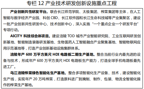 推进以榨菜、中药材为主导的“2+X”现代农业产业技术创新发展。聚焦现代山地特色高效农业发展,强化农业科技园区、智慧农业试点示范。发挥涪陵榨菜产业优势,依托国家蔬菜改良中心、涪陵榨菜研究中心等科创平台,推进涪陵榨菜智能化生产基地建设。支持太极集团、葵花药业、华兰生物研究中心等强化中医药产业和健康领域创新体系布局,大力推动中医药科技创新和药品研发,谋划布局一批重大医学实验室、生物医药创新平台,发展壮大国家火炬涪陵现代中医药特色产业基地。