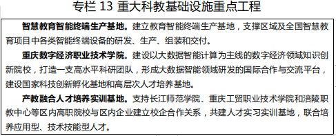 健全科教创新基础设施。打造数字经济人才培养基地,优化人工智能、电子信息工程等数字经济类学科和专业布局,加快推进重庆数字经济职业技术学院建设,争取重庆大学、重庆邮电大学、西南大学等在高新区设立大数据智能化院校(分校)。引进ICT学院,搭建ICT人才培养云平台,开展技术合作、人才培养、实习实训等。