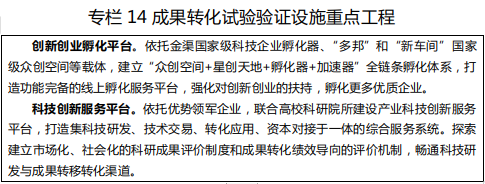 提升创新孵化基础承载能力。推进创新创业孵化载体提质增效,重点建设金渠国家级孵化器、“多邦”和“新车间”国家级众创空间、科创CBD等双创孵化基地,为企业和高校提供科技成果转化、资源共享、人才保障等专业化科技服务。利用互联网平台搭建线上虚拟众创空间,为小微企业、个人创业者提供线上产品营销、创业就业培训、投融资对接等便利化、全要素的开放式综合服务。