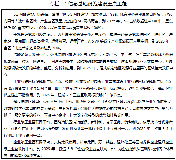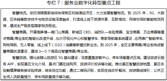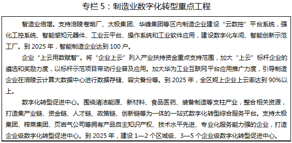 ——产业数字化上水平。到2025年,人工智能、5G、区块链等新一代信息技术与农业、工业、服务业深度融合,三次产业数字化、网络化、智能化水平显著提升,规上企业关键工序数控化率达到65%,智慧农业试验示范基地达到20个,智能制造企业达到100家。