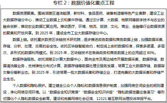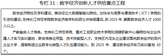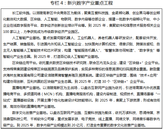 “1”:人工智能与数字经济产业园。以涪陵高新区为主战场,打造成渝地区有重要影响力的人工智能与数字经济产业园,重点发展人工智能、大数据云计算、软件及信息服务、数字内容等产业。