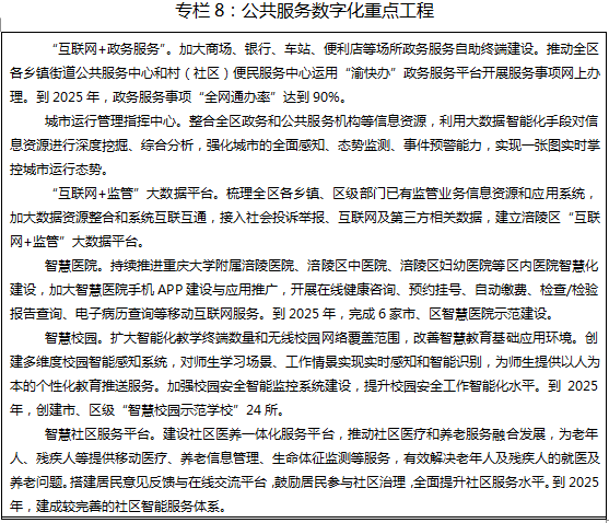 ——治理数字化上台阶。到2025年,新一代信息技术在政府治理和服务领域应用持续深化,政府治理体系和治理能力现代化建设取得阶段性成果,政务管理、城市治理、民生服务等重点领域的数字化公共服务能力显著增强,政务服务事项“全网通办率”达到90%、建成6家智慧医院、24所智慧校园。