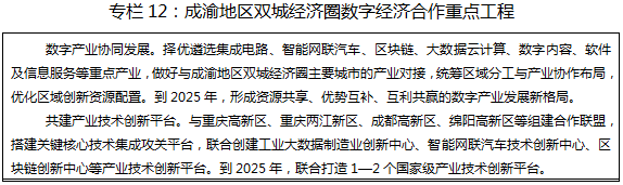 推动数字产业协同发展。联合成渝地区双城经济圈主要城市采取联合组建、共同投资、相互持股等方式集中力量引进一批创新能力强、发展后劲足、带动效应显著的数字经济龙头企业,联合推进数字经济领域大型国有企业落户双城经济圈。联手建设一批数字经济孵化器、众创空间,培育一批前沿领域高成长创新企业、中小微企业和创新团队,切实降低企业税费、融资成本、交易成本等制度性交易成本,推动企业在区域内自由流动和有序聚集。