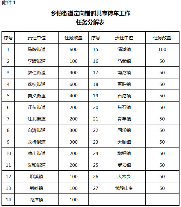 (三)创新机制,赛马比拼。各乡镇街道在工作推进过程中,要加强机制创新,充分发挥基层组织等各方力量,探索推进停车资源集约利用的有效方法,打造运行顺畅、便民惠民、安全有序、具有辨识度的错时共享停车新模式。根据区级总体目标任务,以属地为主进行进一步任务分解,各乡镇街道的具体任务数量见附近1,第一到第四季度计划任务量分别为:10%,30%,30%,30%。各乡镇街道推进定向错时共享停车工作将纳入全区城镇综合管理进行重点考评,实行季度晾晒、赛马比拼、奖优罚劣。