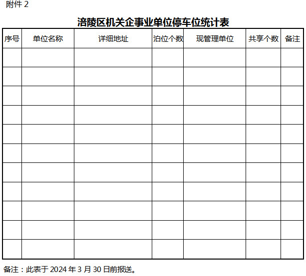 (一)全面排查、试点推进。率先推进符合条件的机关、企事业单位专用停车资源对外开放共享,主动发挥示范引领作用。全区各机关、企事业单位专用停车资源按照原则不少于40%比例参与错时共享停车工作,具体参与车位数量,由所在地辖区乡镇街道进行统计认定。各乡镇街道要于2024年3月30日前,全面排查统计辖区内机关、企事业单位停车资源,确认共享底数(附件2);要持续做好宣传动员工作,不间断收集辖区内共享停车需求,建立供需动态台账(附件3)。重点安保单位、敏感单位以及有其他特殊情况的单位,可以不参与错时共享停车。