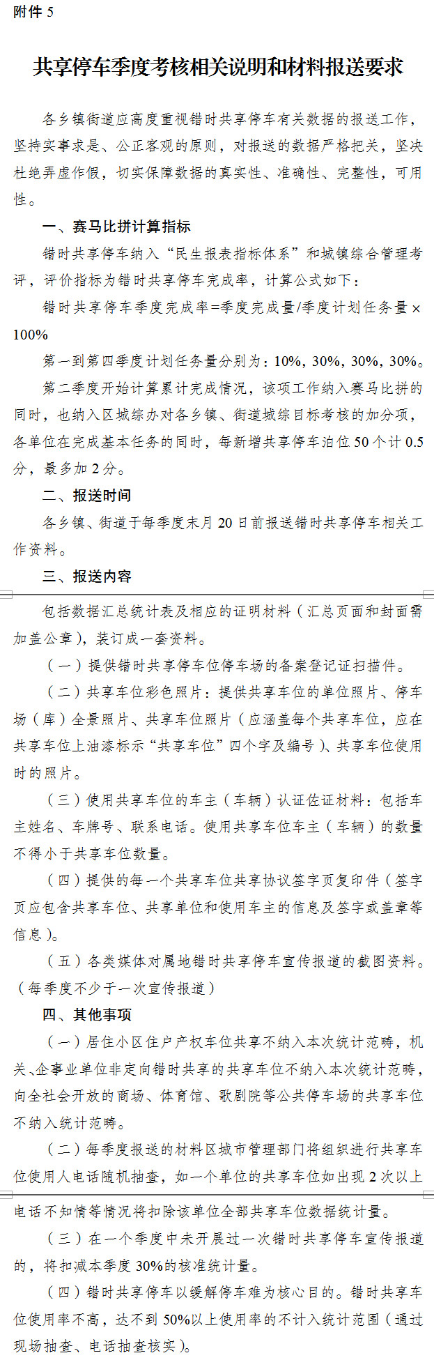 (四)注重宣传,有效报送。要充分利用各类信息平台、网络媒体进行宣传造势,扩大错时共享停车的知晓度和参与度,增强全社会文明停车意识,提升盘活停车存量资源,切实形成停车设施共建、共享、共治的良好局面。区城市管理局要深入挖掘错时共享停车工作的典型案例,总结经验,做好调度。各乡镇街道要按照要求,于每季度末月20日向区城市管理局报送相关资源(具体要求见附件5),联系人:吴金国,联系电话:18723813339。