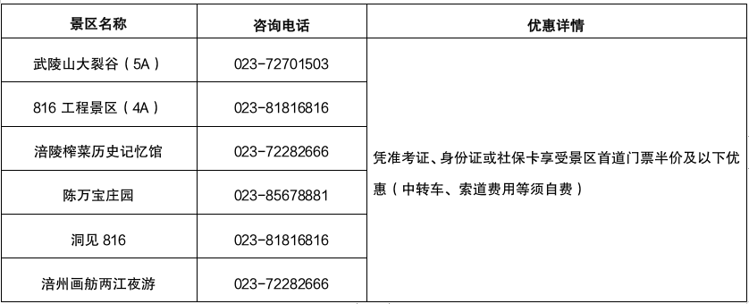 阳春三月,春暖花开。为方便各位考生充分感受“北纬30°花园城市”的新发展、新活力,我们精心衔接了部分景点,从3月12日到3月16日期间,考生可凭准考证、身份证或社保卡享受景区首道门票半价及以下优惠(中转车、索道费用等须自费),欢迎考生朋友们前往体验。