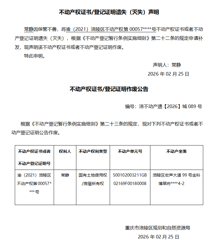 常静涪不动产遗【2026】城089号