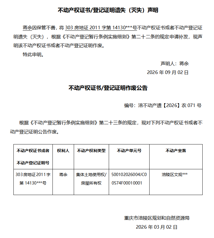 蒋余涪不动产遗【2026】农071号