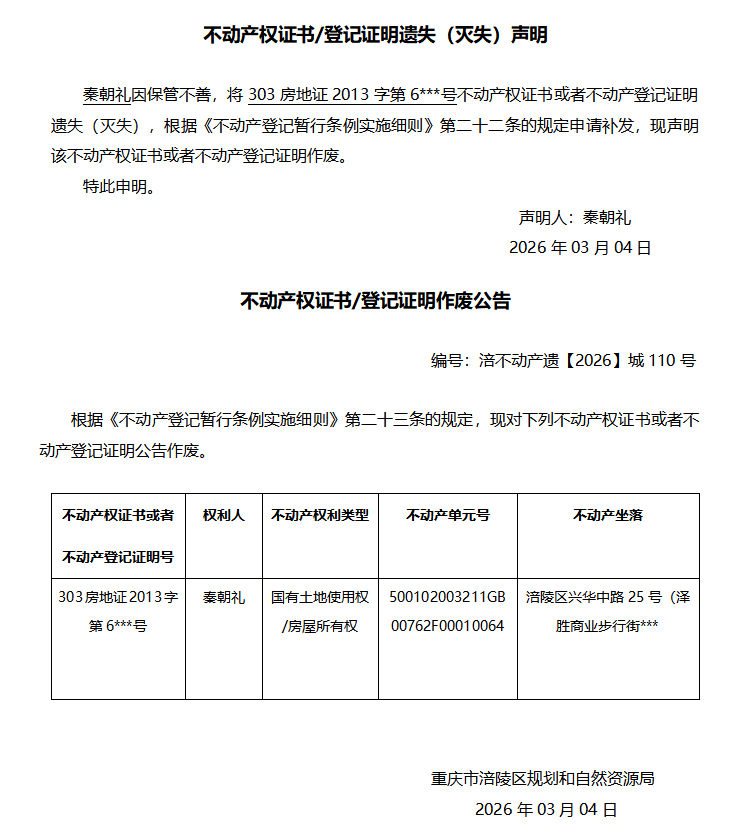 秦朝礼涪不动产遗【2026】城110号