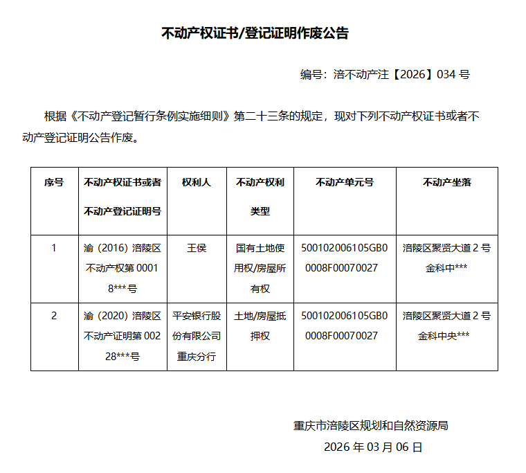 王侯涪不动产注(2026)034号