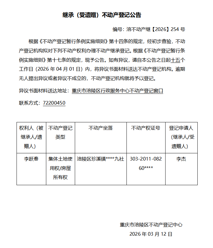 李跃春涪不动产继【2026】254号