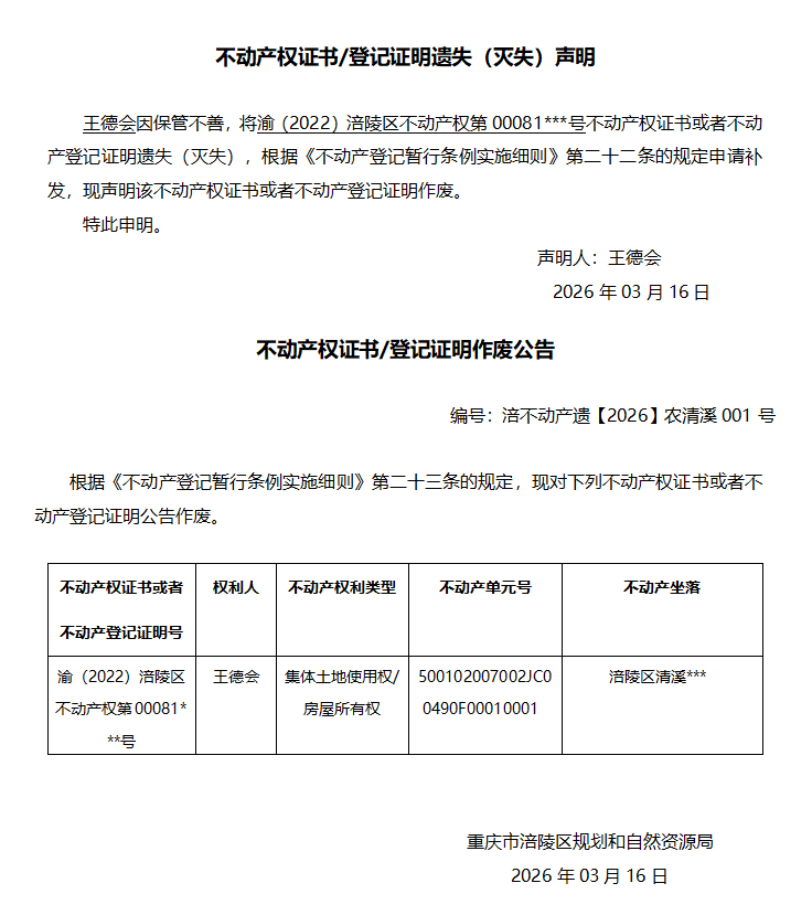 王德会涪不动产遗【2026】农清溪001号