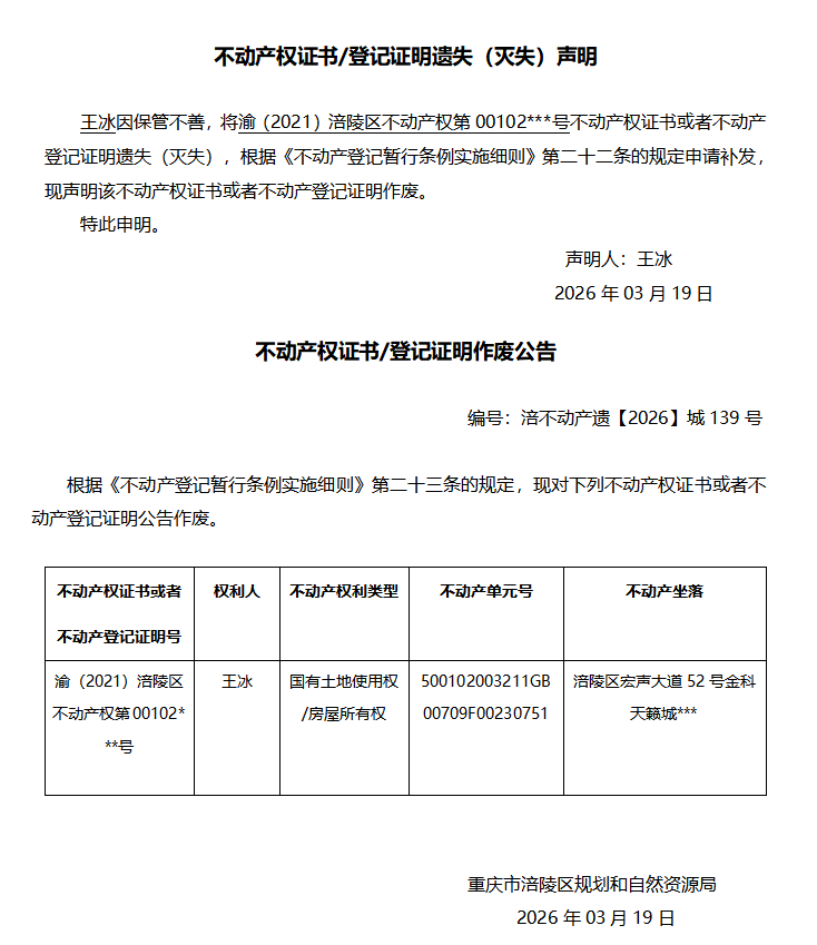 王冰涪不动产遗【2026】城139号