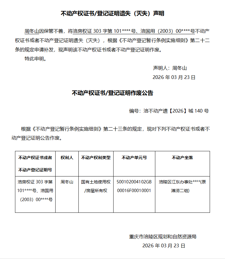 周冬山涪不动产遗【2026】城140号
