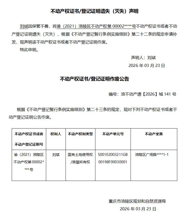 刘斌涪不动产遗【2026】城141号