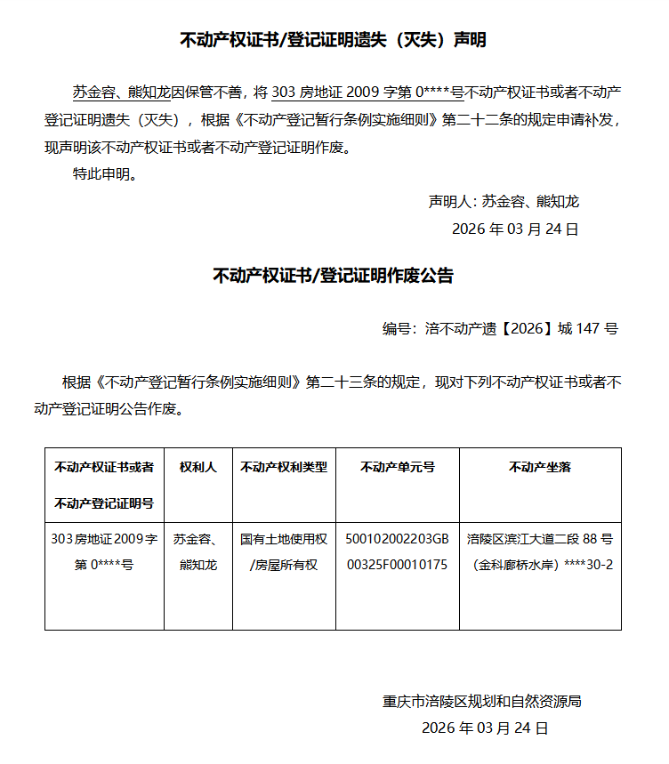 苏金容、熊知龙涪不动产遗【2026】城147号
