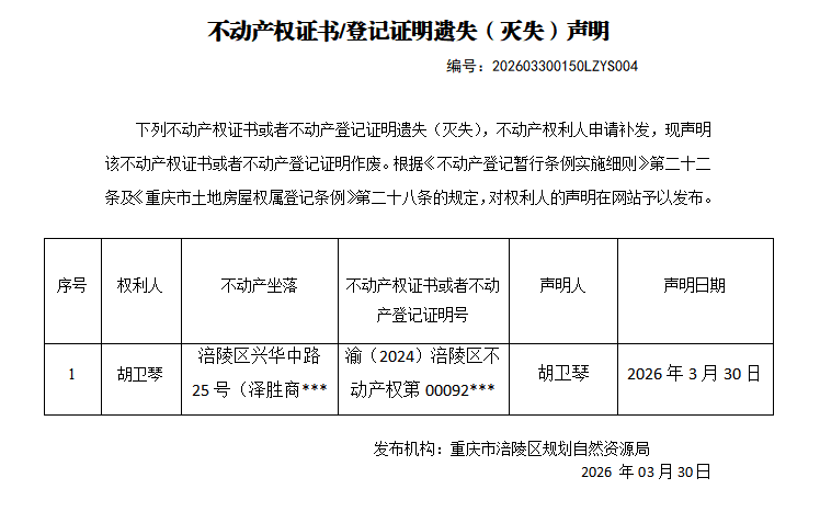 足球竞彩网 不动产遗失(灭失)公告202603300150LZYS004号