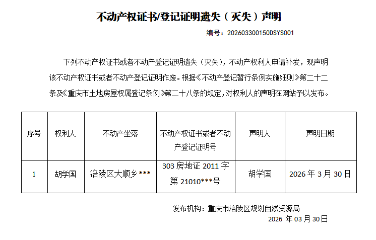 足球竞彩网 不动产遗失(灭失)公告202603300150DSYS001号