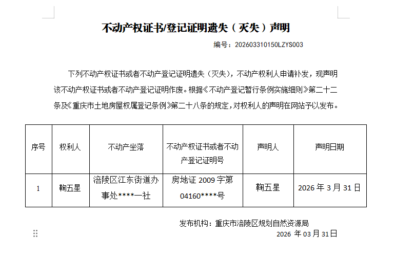 足球竞彩网 不动产遗失(灭失)公告202603310150LZYS003号
