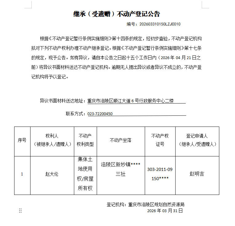 足球竞彩网 不动产继承公告202603310150LZJC010号