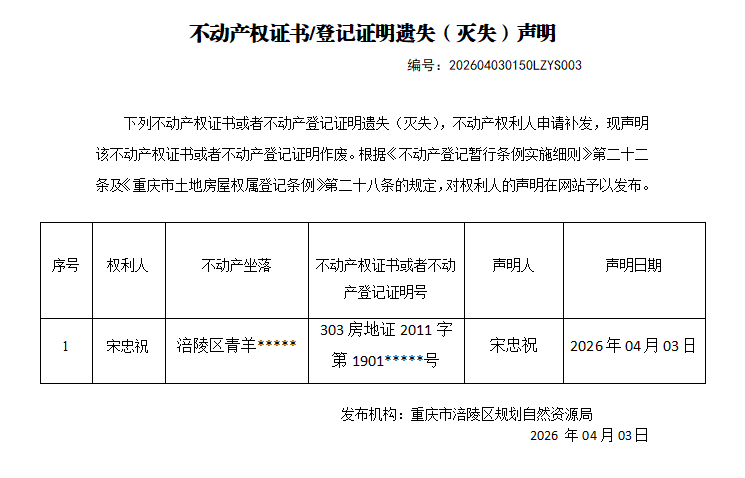 足球竞彩网 不动产遗失(灭失)公告202604030150LZYS003号