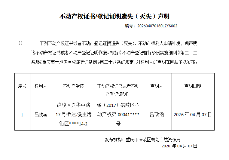 足球竞彩网 不动产遗失(灭失)公告202604070150LZYS002号