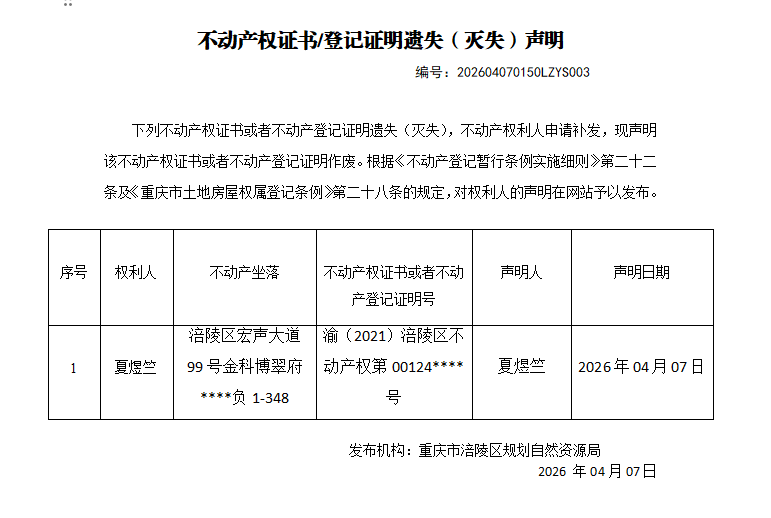 足球竞彩网 不动产遗失(灭失)公告202604070150LZYS003号