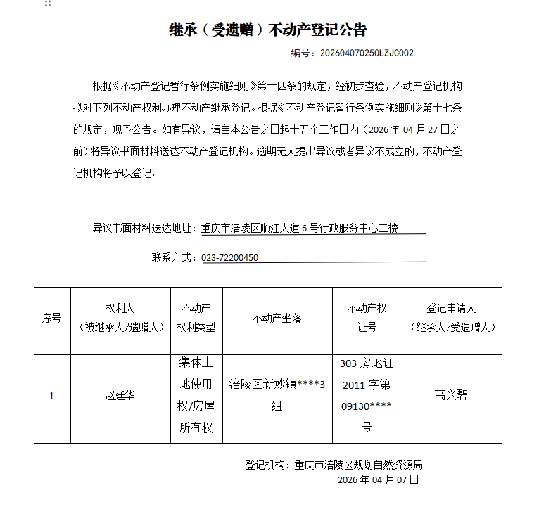 足球竞彩网 不动产继承公告202604070250LZJC002号