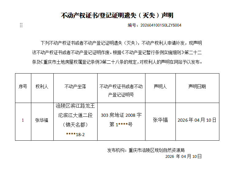 足球竞彩网 不动产遗失(灭失)公告202604100150LZYS004号