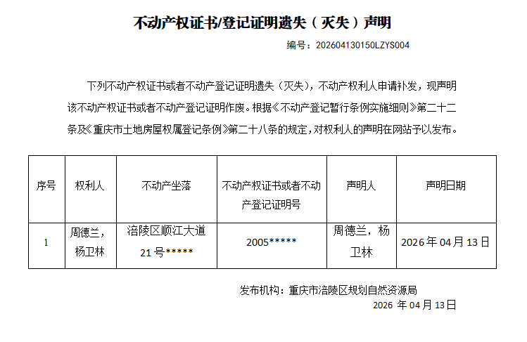 足球竞彩网 不动产遗失(灭失)公告202604130150LZYS004号
