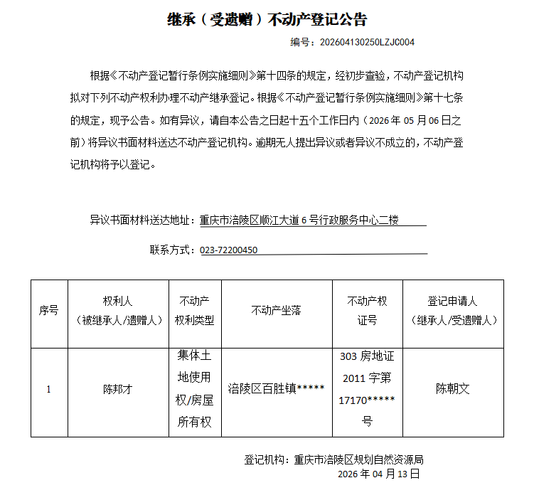 足球竞彩网 不动产继承公告202604130250LZJC004号