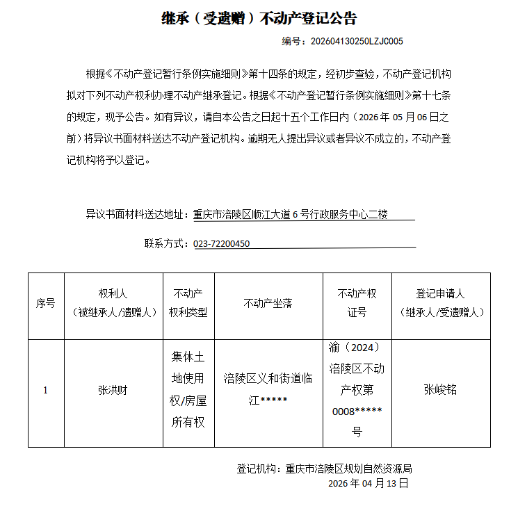 足球竞彩网 不动产继承公告202604130250LZJC005号