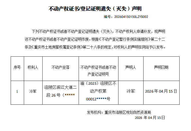 足球竞彩网 不动产遗失(灭失)公告202604150150LZYS002号