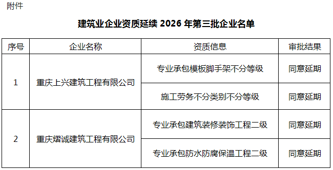 根据《中华人民共和国建筑法》及有关建设工程企业资质管理规定,我委对近期部分建筑业企业申请施工资质延续的材料进行了审查,现将审查意见予以公示(审查情况附后)。公示日期为2026年4月15日至2026年4月24日。