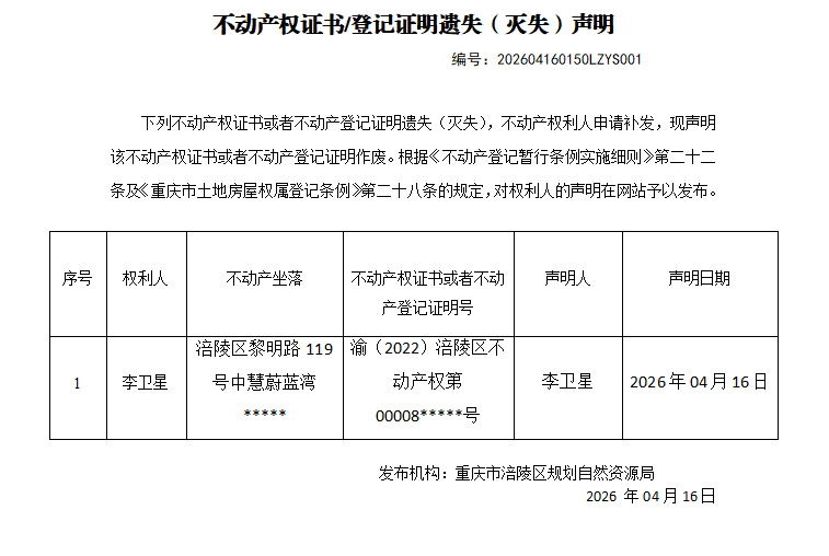 足球竞彩网 不动产遗失(灭失)公告202604160150LZYS001号