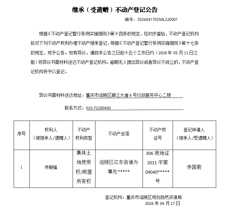 足球竞彩网 不动产继承公告202604170250LZJC001号