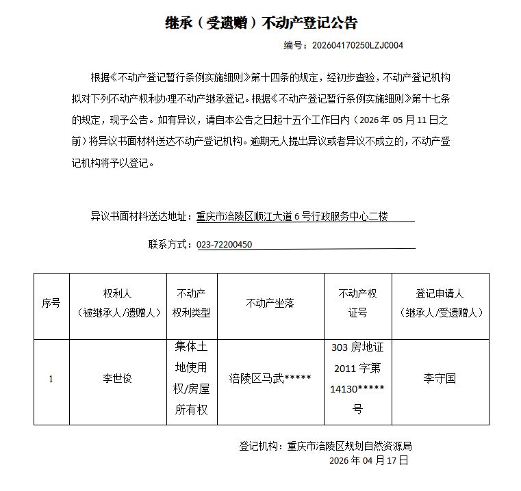 足球竞彩网 不动产继承公告202604170250LZJC004号