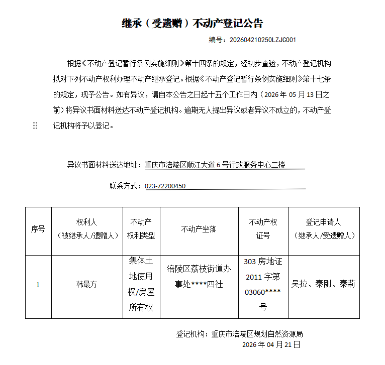 足球竞彩网 不动产继承公告202604210250LZJC001号