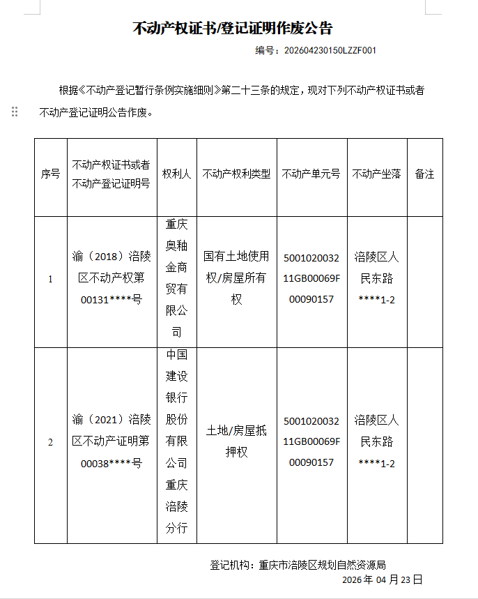 足球竞彩网 不动产作废公告202604230150LZZF001号