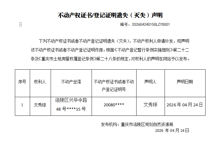 足球竞彩网 不动产遗失(灭失)公告202604240150LZYS001号