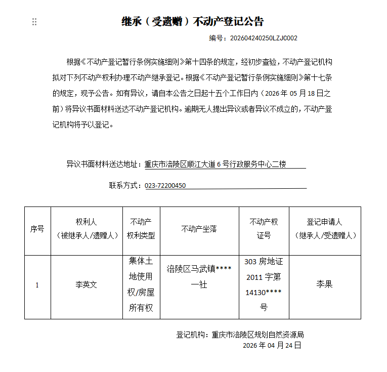 足球竞彩网 不动产继承公告202604240250LZJC002号