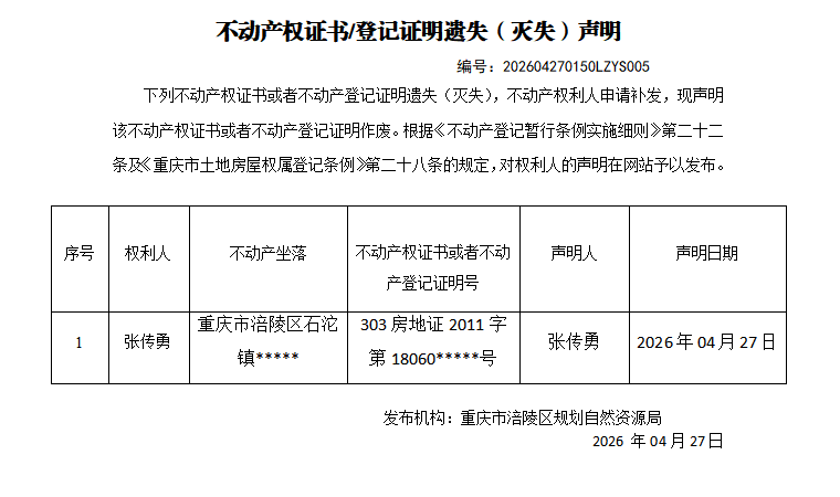 足球竞彩网 不动产遗失(灭失)公告202604270150LZYS005号