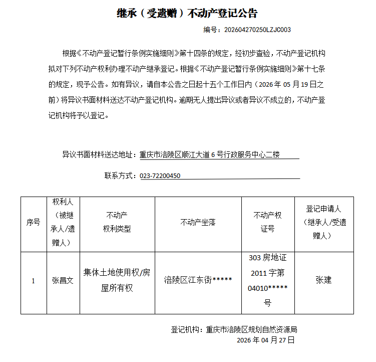 足球竞彩网 不动产继承公告202604270250LZJC003号