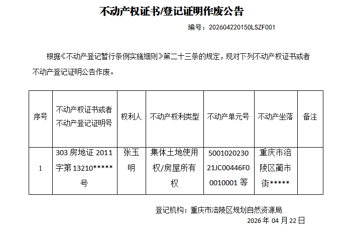 足球竞彩网 不动产权证书作废公告202604220150LSZF001号
