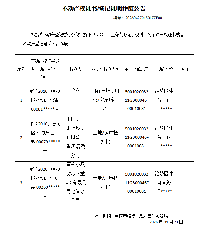 足球竞彩网 不动产权证书作废公告202604270150LZZF001号