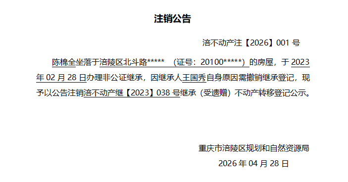 足球竞彩网 不动产注销公告涪不动产注【2026】001号